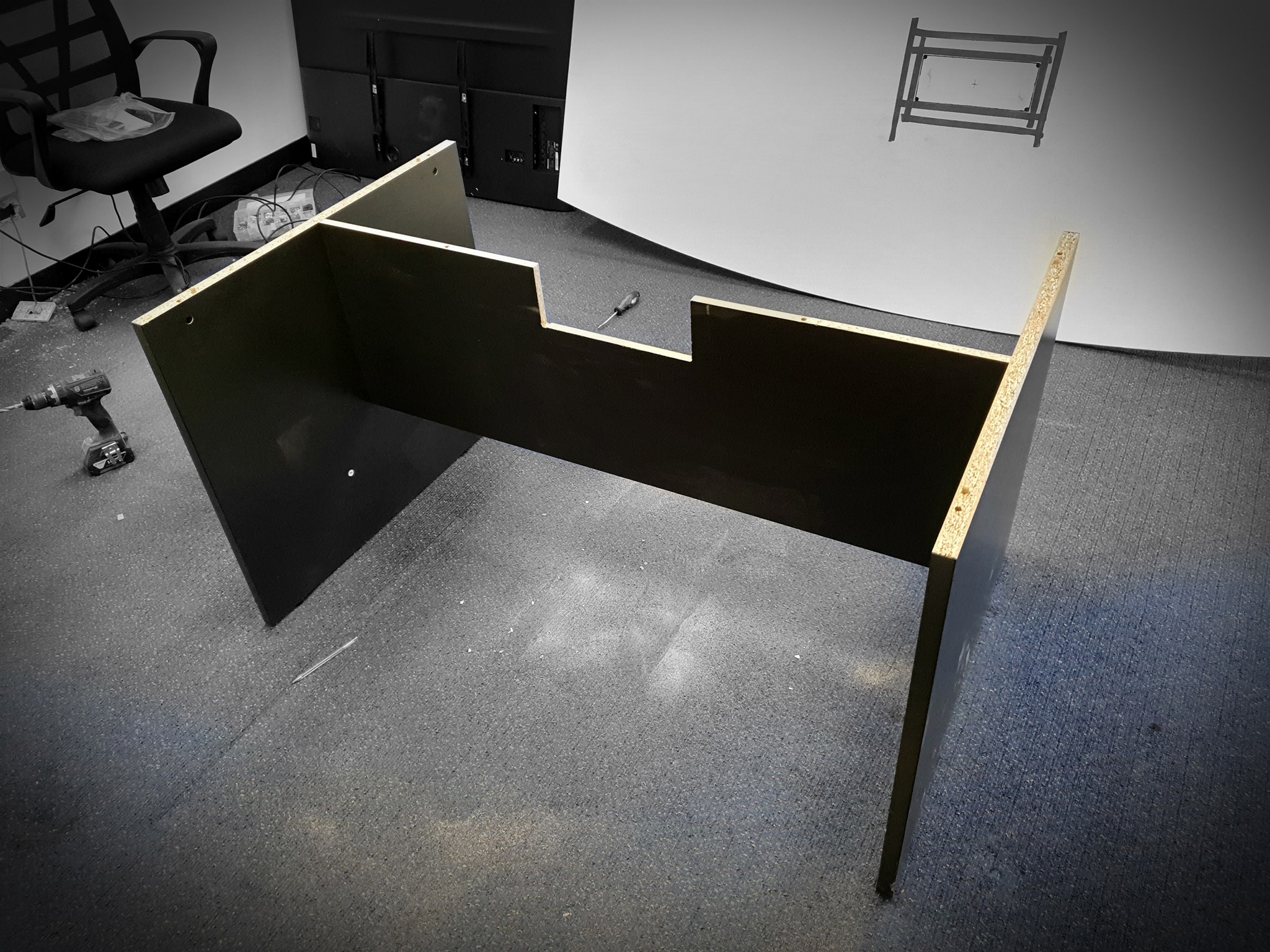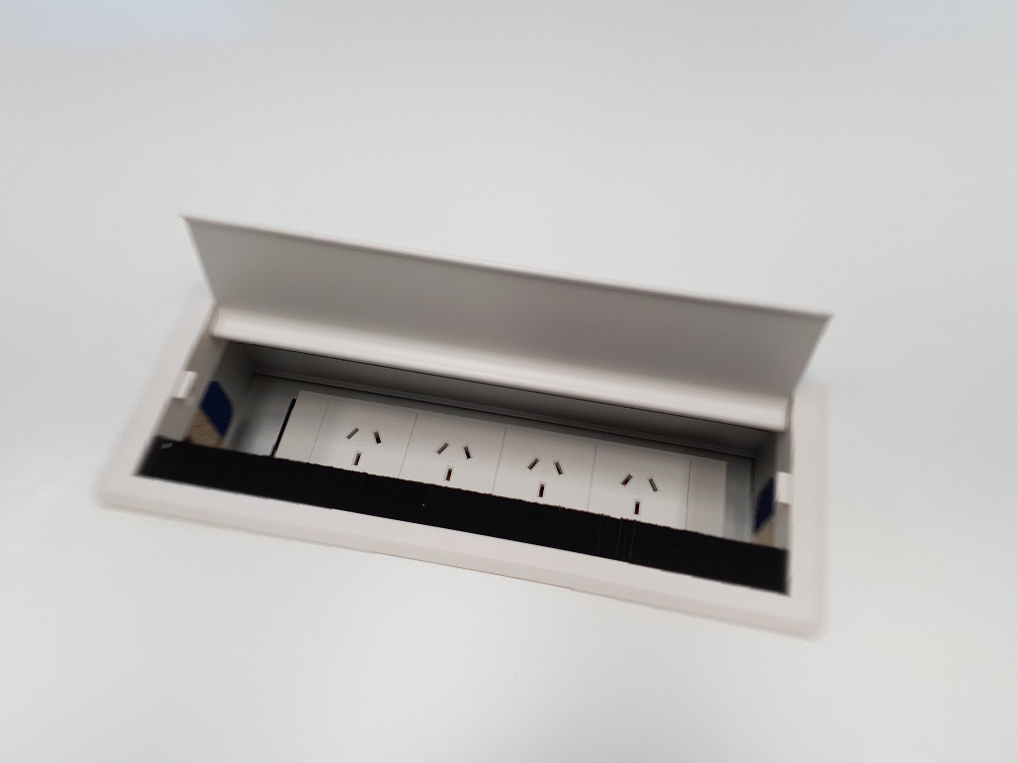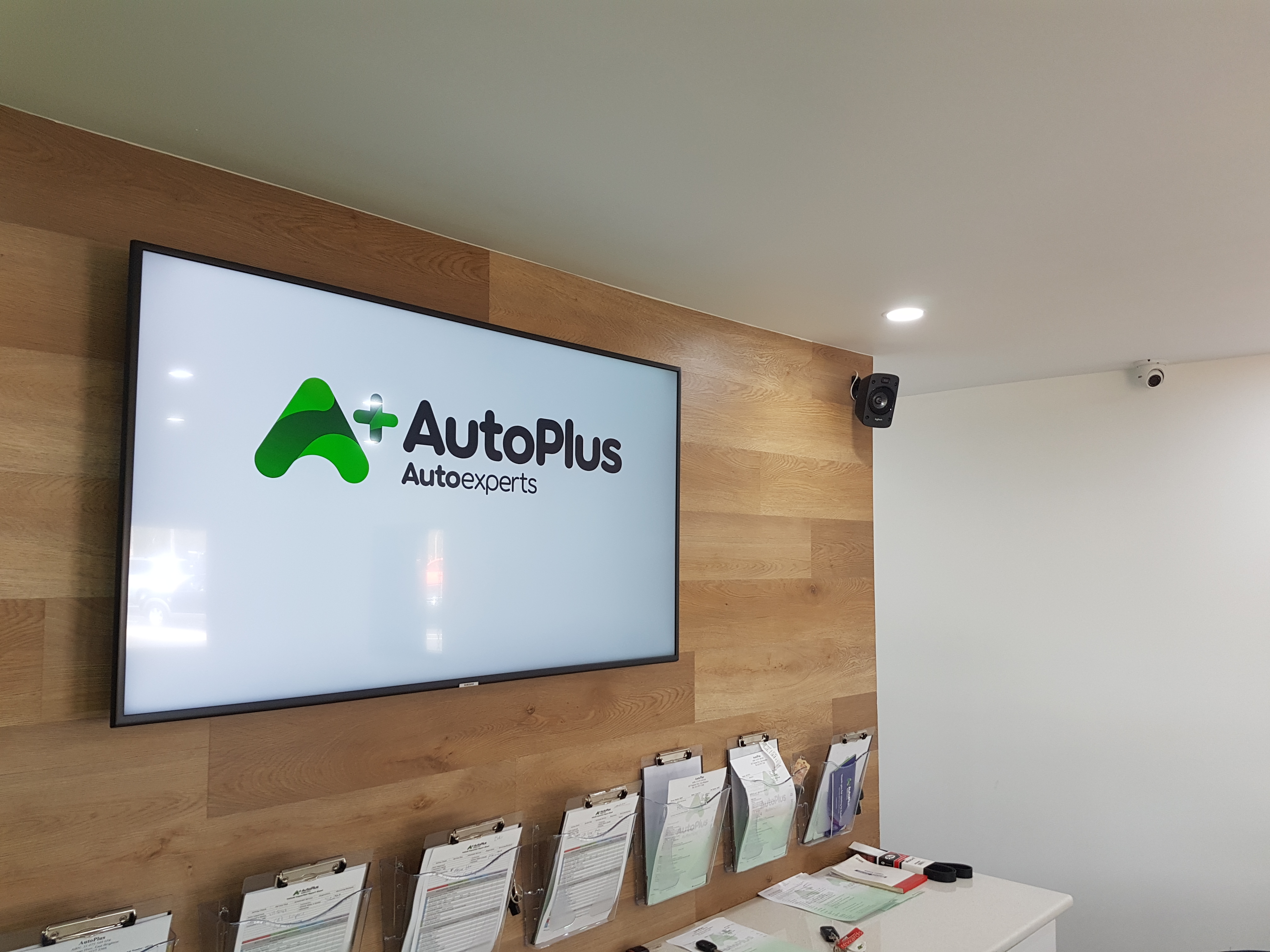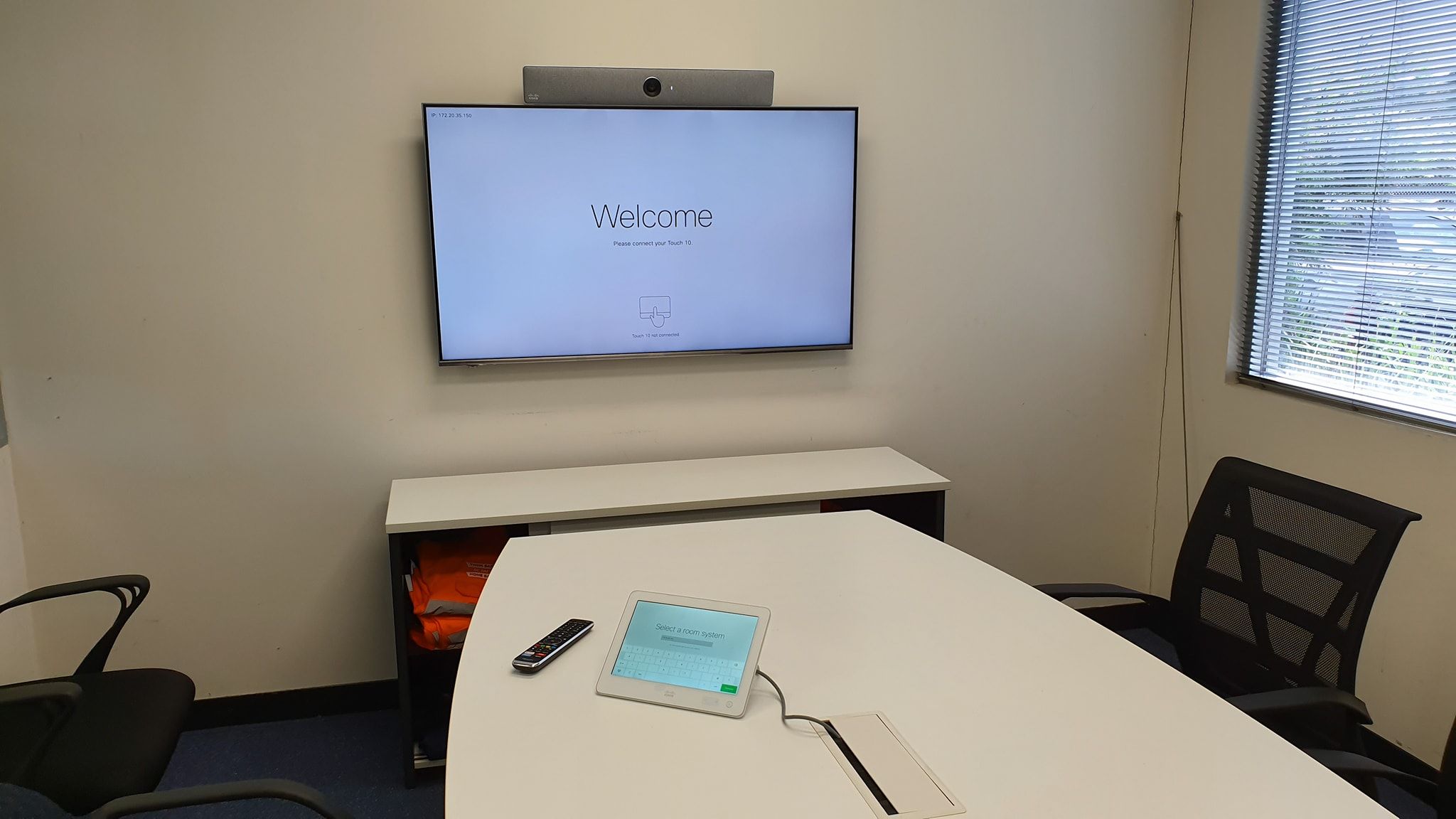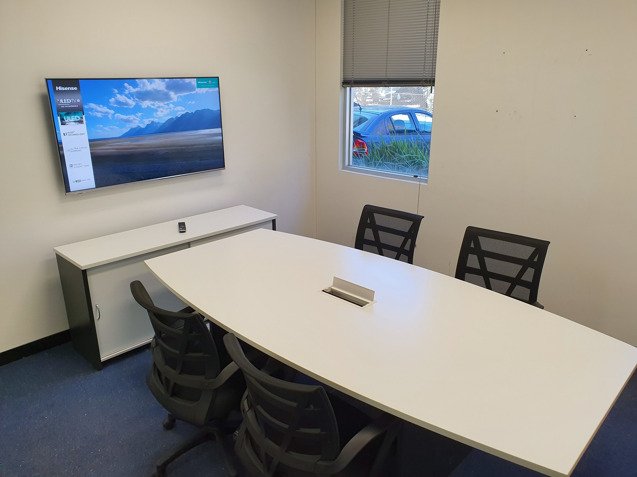 A Wall-hanging 55" LCD with Power Points, HDMI and Cat6 Data. All wired back to Desk Box, that we cut into the boardroom table with precision. Giving your staff plenty of ports to plug into without running cords across the room, as well as auto-tracking cameras for remote conference meetings.